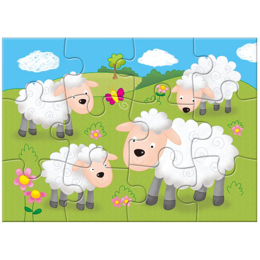 Set of 4 first puzzles featuring farm animals. Puzzles have different numbers of pieces to encourage the development of matching and sorting skills. 4 puzzles with 4, 6, 8 and 12 pieces.