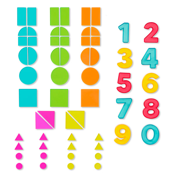 Powered by USB-C cable or battery, it's ready to use wherever you are. This complete set includes 10 numbers, 50 geometric shapes, a storage bag for the pieces, 3 interchangeable transparent colouring sheets, and 5 coloured erasable markers with an eraser brush for hours of educational play.