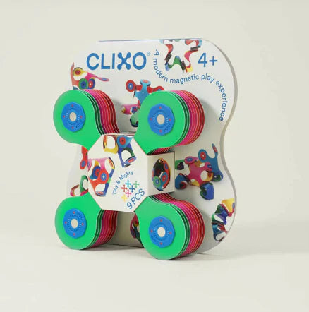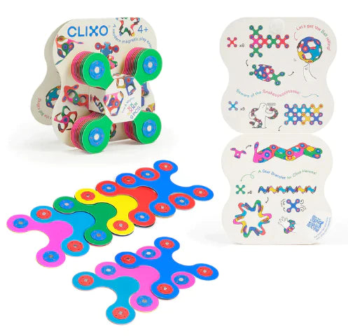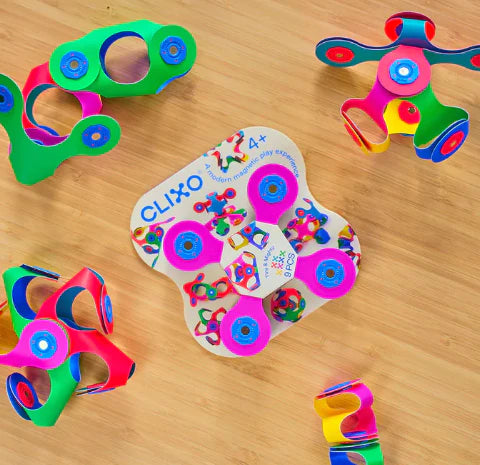 Many factors make Clixo infinitely unique. Unlike other building sets on the market, Clixo pieces are flexible and don’t require a flat surface to build or play. The pieces also stack easily and pack light to make it easier for kids to play with or wear on the go. Strong, durable magnets enable kids to stick it to any magnetic surface for even more play possibilities. Lastly, cleanup is a snap – just stack the pieces up, and you’re all done!