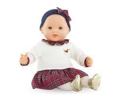 Suzanne Corolle Holidays a 14-inch soft-bodied baby doll with brown sleepy eyes for little ones wanting a baby of their own to love. Suzanne has a weighted bottom so she can sit up by herself, and her head and limbs are made of soft vinyl that is delicately scented with vanilla, a Corolle signature. Her brown eyes close when she's put down for a nap or at bedtime, like a real baby. She can even suck her thumb, also like a real baby. Suzanne is stylishly dressed for the holidays in a white knit top with tartan accents, a matching tartan skirt and headband, white tights and gold shoes.