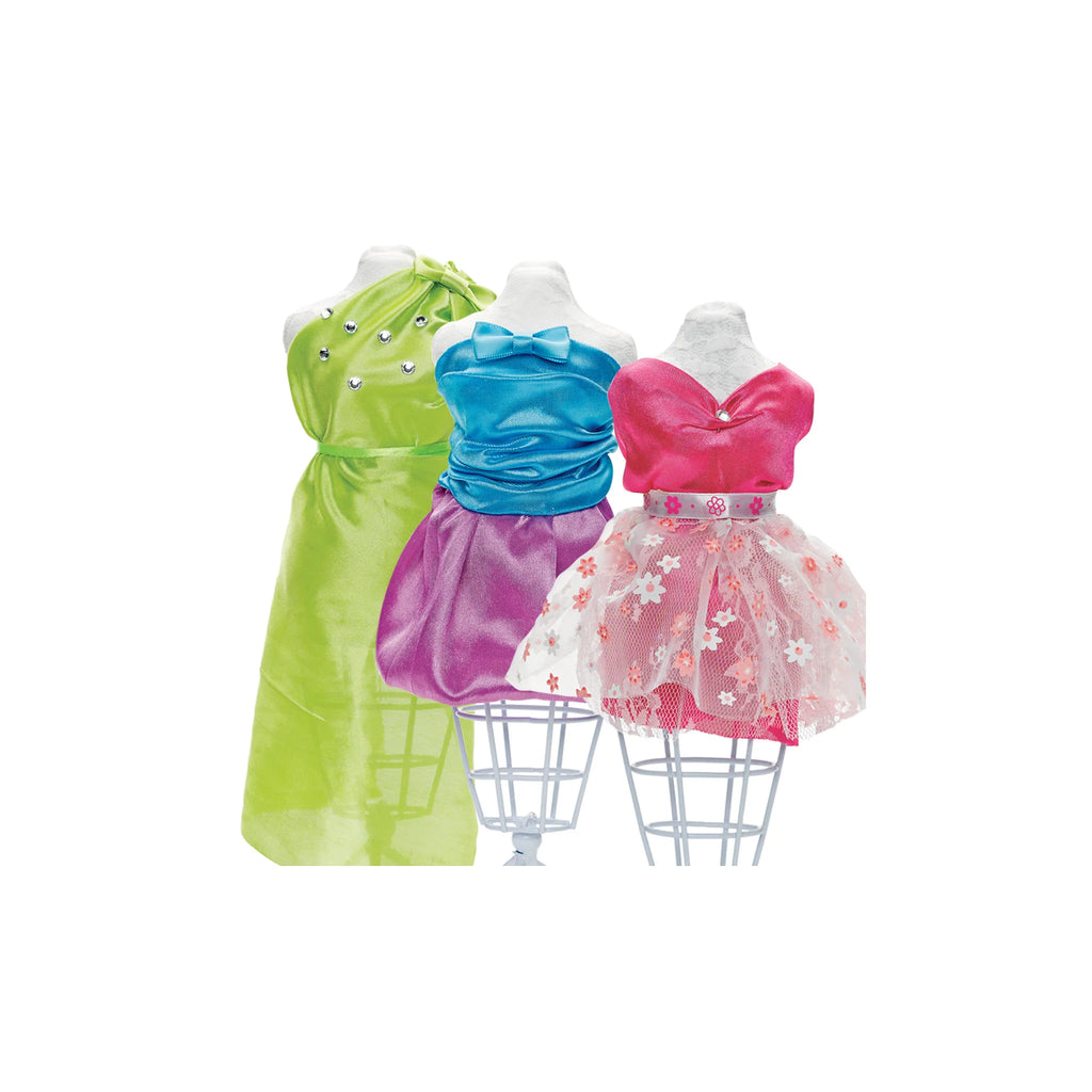 Includes trendy fabrics and accessories for fashion fun. Ultimate set contains a lace-covered dress mannequin, sewing essentials, sketch book, fabrics, swatch booklet, trims, ribbons and embellishments. 50+ pieces in all.