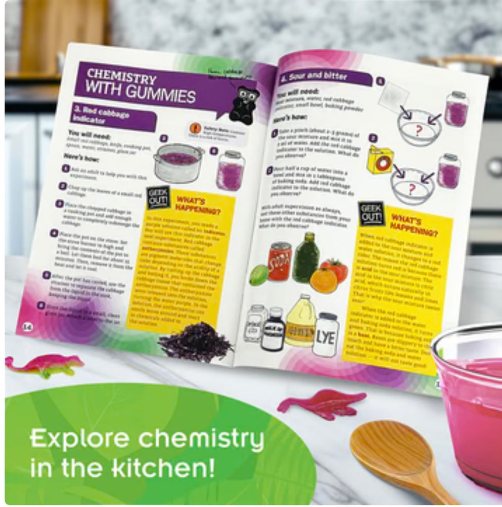 Tasty Triceratops! Scrumptious Stegosaurus! Toothsome Pterodactyl! Whip up your own delicious dinosaur-shaped gummies! As you prepare these yummy treats, you’ll investigate the chemistry related to candy making and explore fundamental STEM concepts such as measurements, conversions, temperature reading, phases of matter, the scientific properties of natural polymers, and more. The kit includes all the food ingredients needed to whip up a gelatin mixture, which you pour into the included mold to form eight different dino shapes: Tyrannosaurus rex, Pterodactyl, Triceratops, Spinosaurus, Stegosaurus, Ankylosaurus, Plesiosaur, and Brachiosaurus. A specially designed recipe and custom tooling help ensure successful results and great-tasting gummies in two yummy flavors: purple mixed berry and green watermelon. You can even add citric acid to make sour gummies! Make up to 72 gummies with the ingredients and tools included!