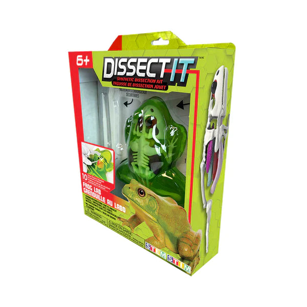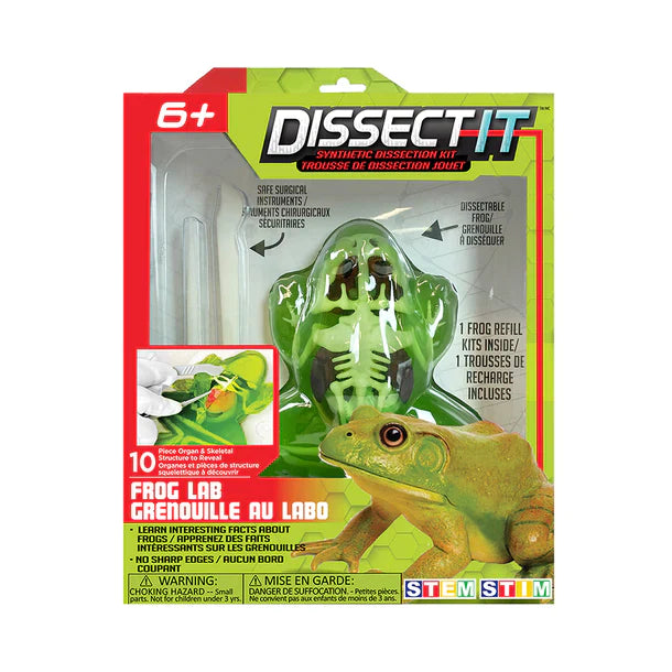 Dissect-It Frog Lab is described as a fun learning activity toy featuring a carvable gelatin frog that contains a 10-piece skeletal structure including organs. Using the provided tools and dissection table Dissect-It Frog Lab simulates the experience and wonder of scientific dissection. The kit also comes with a free refill pack that allows for the molding of an additional frog after dissecting the provided frog. Includes:10-piece skeletal structure, organs and free refill pack.
