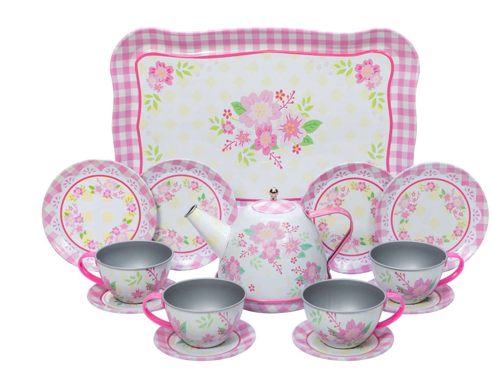 • Beautiful flowers, leaves and lace decorate this classic tin tea set that’s perfect for afternoon tea