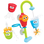 A battery operated bath spout that easily attaches and draws water from the tub, creating an endless stream without wasting water from the bath tap.3 interchangeable bath cups, each with a different water straining, spouting and spraying effect. Peek-A-Boo friend floats to the top as cup fills up. Stack cups and watch water run through them all! Watch the water spin the propeller. Block the crazy finger sprinkler for cool water squirts! Easy for kids to operate. Specially designed for small hands. Swiveling arm holds the bath cups – for playing, stacking and storage.