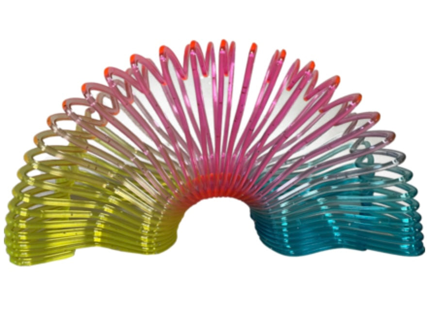 The butterfly-shaped accordion-like Glitter Rainbow Spring from Toysmith will mesmerize little ones. Showcasing vibrant colors of the rainbow and shimmering with glitter, the Glitter Rainbow Spring is a great fidget item that can be pulled apart or stacked together. Hold one end in one hand, stretch out the spring with the other hand, and then let it go for a satisfying light clap sound.