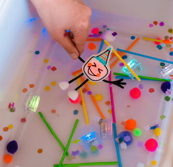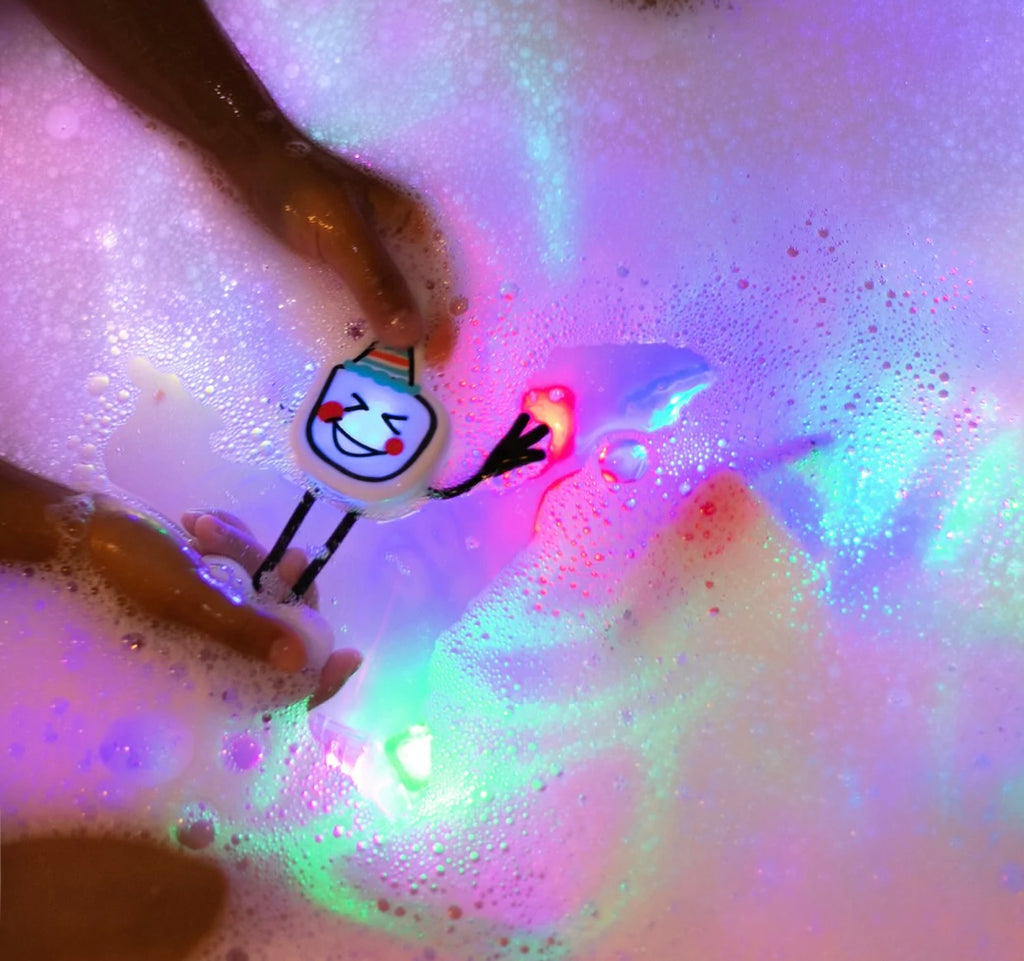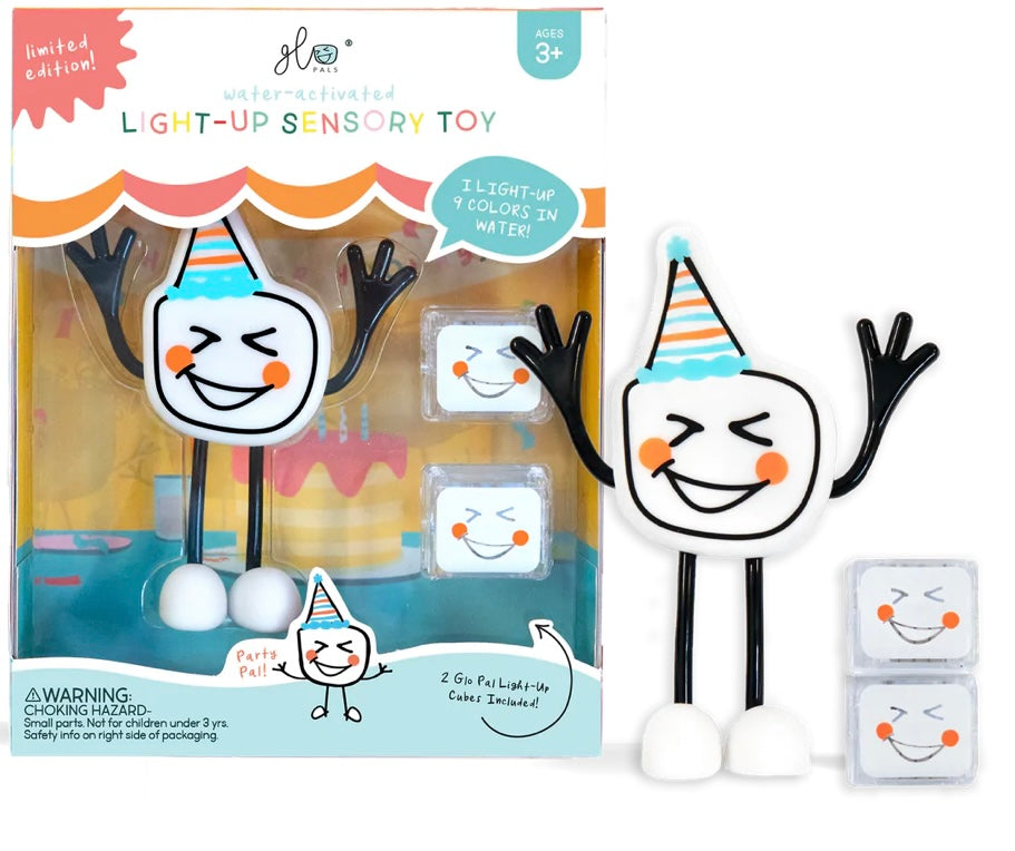 Insert your Glo Pals Light-Up Cube into the back of each Pal, drop it in the water, and watch it light up! Featuring bendable arms and colorful personalities, each Pal proudly illustrates the uniqueness in every child! Party Pal comes with two multicolored Glo Pals Light-Up Cubes included in the box!