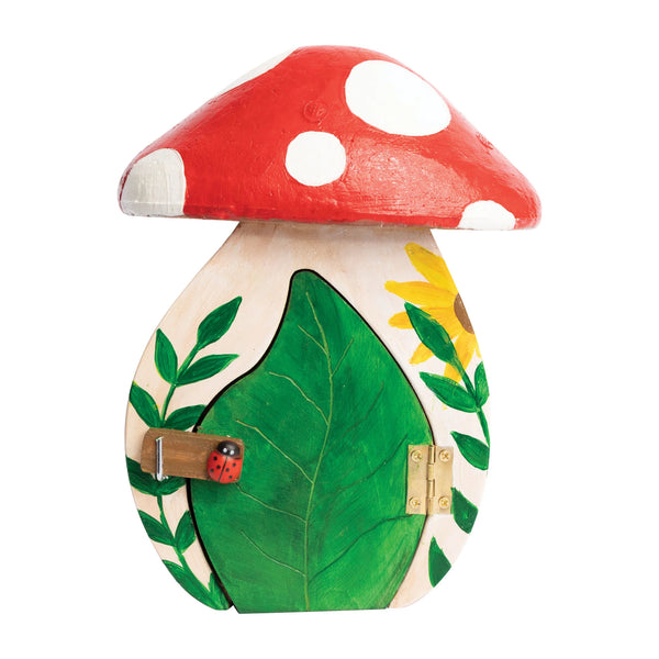 The mushroom-shaped, wooden gnome door comes ready to decorate inside and out with bright weather-resistant paints and accessories.