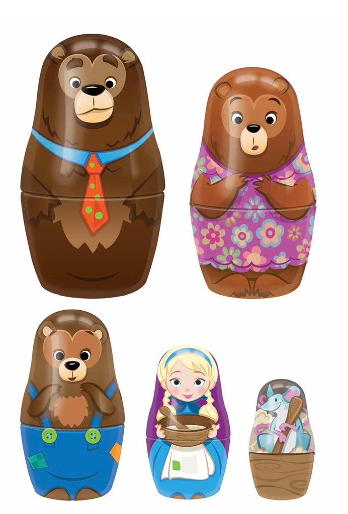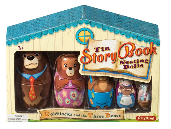 A true classic toy now featuring Goldilocks and the 3 Bears! Made of tin, the tallest one measures 4.25″ tall. 5 tin nesting dolls in total.