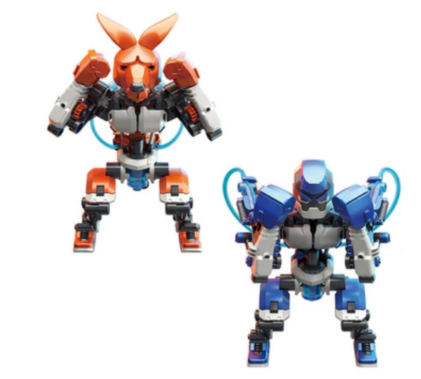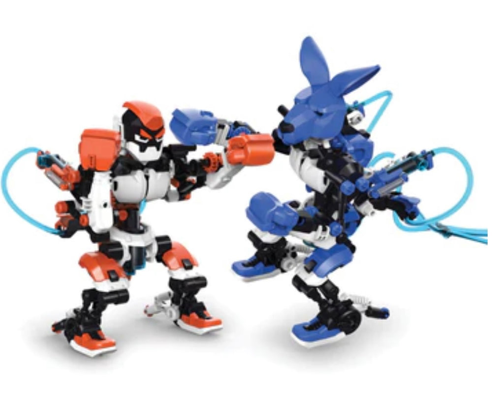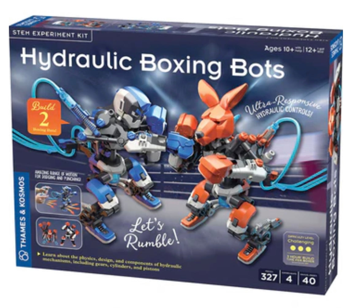 Ding! Ding! Jab, dodge, uppercut! These boxing robots use hydraulic power to move like real boxers. Packed with the excitement of a boxing match and the fun of constructing incredible mechanical models, this kit allows you to build two boxing robots and challenge a friend to a match. With complex shoulder gestures, two boxing punches (jab and uppercut), three waist postures, and interchangeable heads, these robots are designed to float like butterflies and sting like bees. Use the handheld hydraulic controls to fight like a champ. Knock your opponent robot’s head backward and score a point on the included scoreboard. Learn about how these amazing machines and hydraulic systems work. Leave the rocking and socking to the lightweights — this awesome STEM kit really packs a punch!