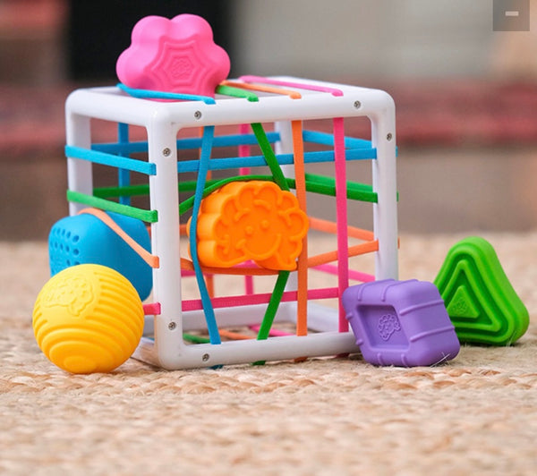 But the best part? As kids push the shapes through the elastic bands of the cube, curiosity is sparked and young minds can't help but explore, experiment, and discover.
