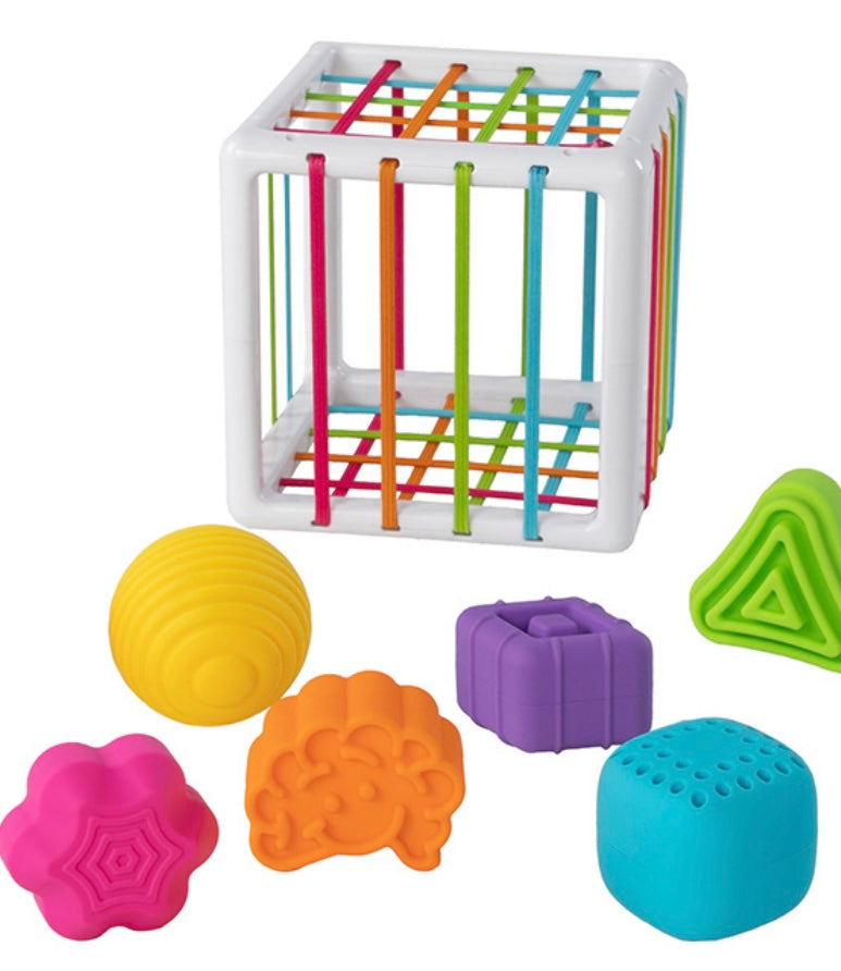 6 chunky, uniquely textured shapes fit through the elastic bands of the cube