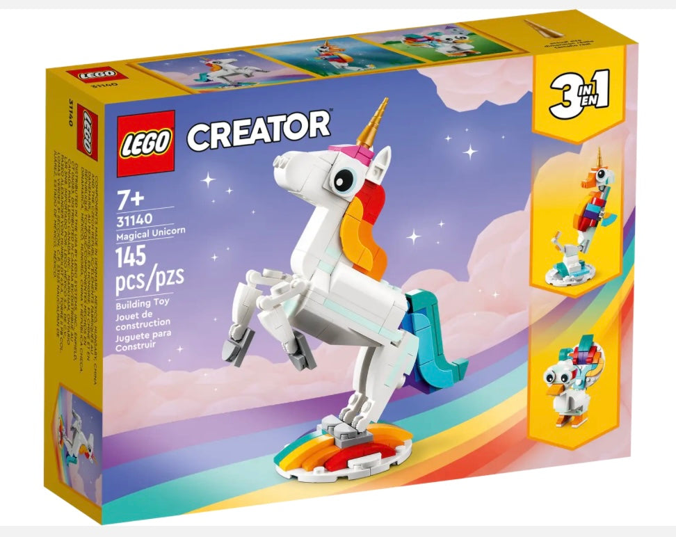 Imaginative kids aged 7+ can be transported to a mythical land for enthralling action with this 3in1 Magical Unicorn (31140) building set. It features a unicorn toy with a golden horn, colorful tail, and posable legs and hooves. It can be presented in 2 different positions: standing on 4 legs or reared up on its 2 hind legs for an iconic pose and displayed on the set's rainbow stand. Build colorful animals from LEGO bricks The mythical action never stops with 3 different magical creatures for little builders to assemble in this LEGO Creator 3in1 set. They can build a posable Magical Unicorn, rebuild it into a posable seahorse toy with a seabed stand, turn it into a posable magical peacock with a colorful tail, or even use the bricks to create another enchanting creature. LEGO Builder app Download the LEGO Builder app and step into a new world of building fun where kids can zoom in and rotate models in 3D, save sets and track their