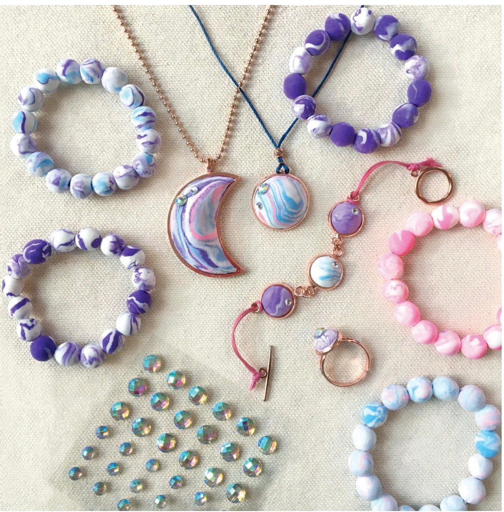 • Make 5 marbled beaded bracelets, 2 pendant necklaces, a charm bracelet and a ring!