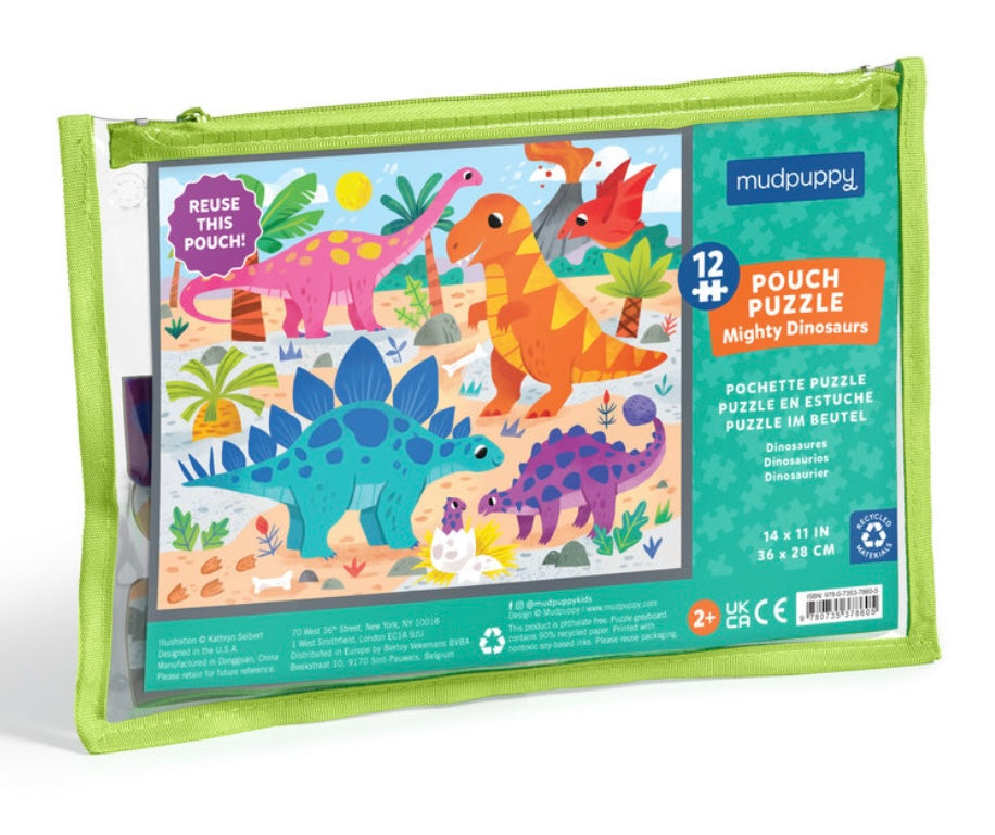 Discover a prehistoric world with Mudpuppy's Mighty Dinosaurs 12 Piece Pouch Puzzle! Featuring 12 extra-thick pieces, perfect for small hands, this jigsaw puzzle is packaged in a secure, reusable pouch with ribbon edging and coordinating zipper for easy storage and travel.