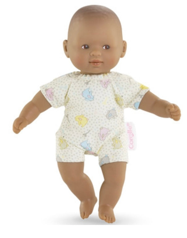Mini Calin Bunnies Brown Eyes is an 8-inch baby doll that is lighweight and the perfect size to take along everywhere. Its head and limbs are made of soft-to-the touch vinyl that is lightly scented with vanilla, a Corolle signature. Mini Calin Bunnies Brown Eyes is part of the mon premier poupon Corolle collection of dolls, fashions and accessories for early nurtering time. With brown painted eyes.