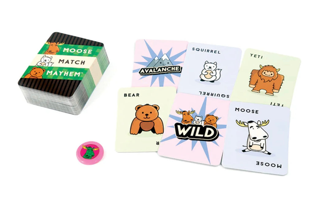 Each player takes a card from the stack. Everyone chants “Moose! Match! Mayhem!” flips their card over and races to grab the best card to make a match. The first player to collect three sets of animals wins!M