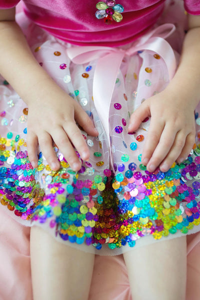 Be the life of the party in this fun multi-coloured sequined skirt. Perfect for days of celebration or for dancing around the house. This soft pink skirt is covered in rows of rainbow sequins and finished with a satin bow at the waist.