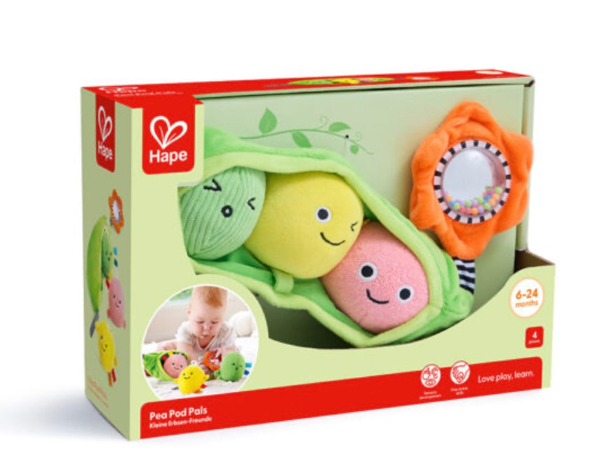 The Hape Pea Pod Pals is an engaging infant toy designed to stimulate sensory development. It includes three colourful balls, each offering a unique tactile experience: one with crinkle material, one with a bell, and one with a rattle. Additionally, a flower rattle with a mirror in the middle is included for visual exploration. Made from various fabric textures, this toy promotes fine motor skills and sensory exploration, making playtime both fun and educational for young children.