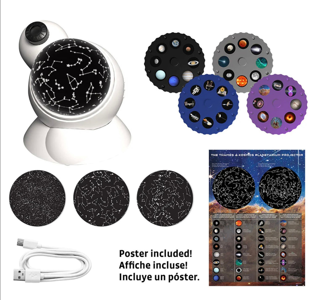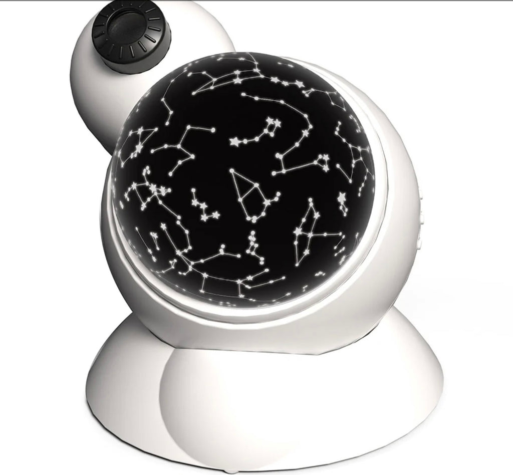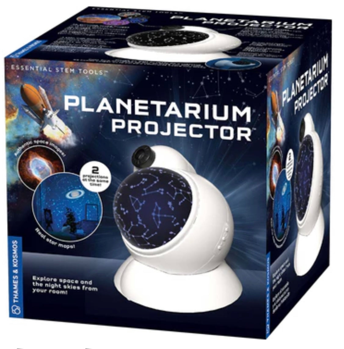 Turn your bedroom into your very own planetarium theater! Illuminate a darkened room by casting projections of the stars in the night sky and space-themed images across the ceiling and walls. This home planetarium is actually two projectors in one. The first is a rotating star map dome that projects astronomically accurate maps of the stars; star maps for both the northern and southern hemispheres are included. The second projects space-related images, including all eight planets, eight human-made space objects like rockets and satellites, and eight extragalactic phenomena like nebula and galaxies. Use nightlight mode to automatically shut off the projector after 15, 30, or 60 minutes. The compact, space-saving design can be placed on a flat surface or hung on a wall. Includes color educational poster and instruction sheet.