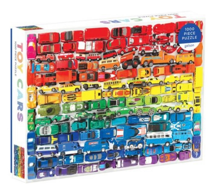 Galison's Rainbow Toy Cars 1000 Piece Puzzle features a collection of miniature toy cars and vehicles arranged in an array of color. Photo by Julie Seabrook of Hey Jules Studio.