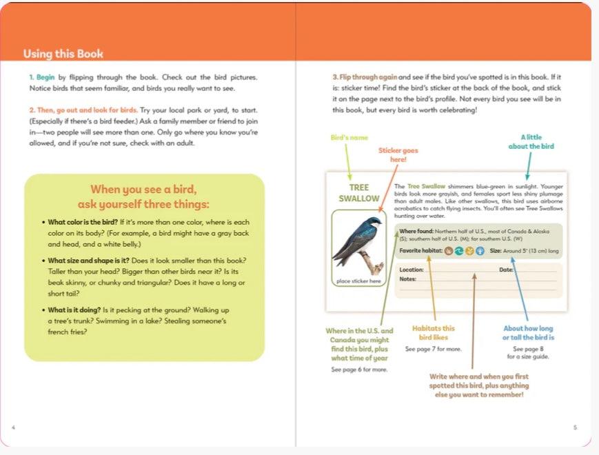 - Full-color sticker book interior offers facts about each bird, general location info, and habitat hints, plus tips for new birders.