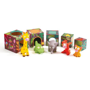 Construction, imagination, handling: the little one invents stories with animals and the boxes. 5 cubes and 5 animals