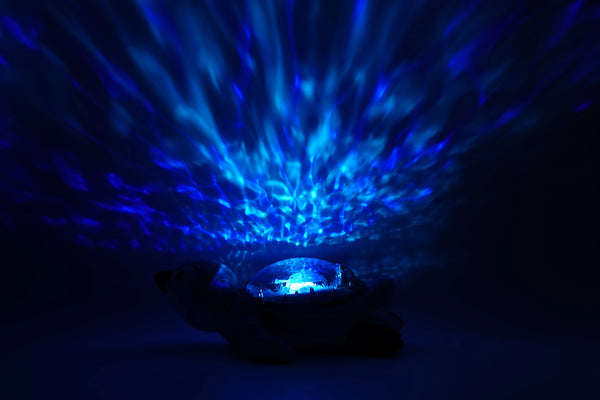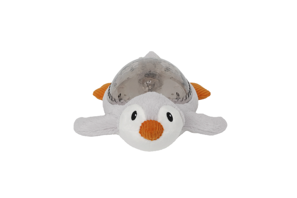 Tranquil Penguin™ is a cute musical nightlight that glows with a soft light and projects polar underwater light effect on the bedroom ceiling, thanks to a unique patented mechanism. Tranquil Penguin™ musical nightlight soothes baby and reassures children who are afraid of the dark. A soft plush during the day, it transforms into a nightlight at night. The moving color projection in two colors creates a magical polar light effect. Melodies and white noises will soothe the little ones to help carry them away to dreamland. It has 4 soothing sounds: underwater melody, Tranquil melody, whale song, ocean waves and 6 adjustable volume levels. An intelligent Cry Sensor, with adjustable sensitivity, restarts at baby's first cry. The brightness of the projection can be adjusted to suit different environments. The 23-minute timer ensures complete darkness and silence while your child sleeps soundly. The battery is recharged using a USB-C cable. Tranquil Penguin™ nightlight is made of 100% recycled padding and stuffing from plastic bottles, with GRS certification, and comes in a FSC certified packaging, which contributes to biodiversity sustainability. Tranquil Penguin™ is an eco-responsible and environmentally friendly plush toy.
