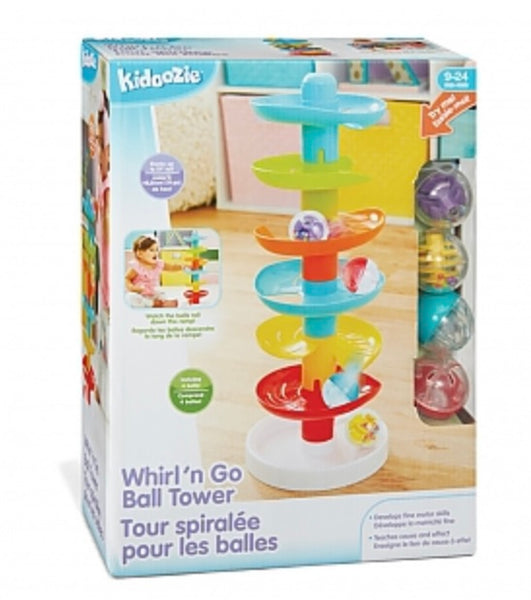 - PRODUCT SPECIFICATIONS: Package contains (1) Kidoozie Whirl ‘n Go Ball Tower. Includes six colorful levels and four balls. Features fun lights and sounds the encourage and excite children. Recommended for children ages 9 to 24 months